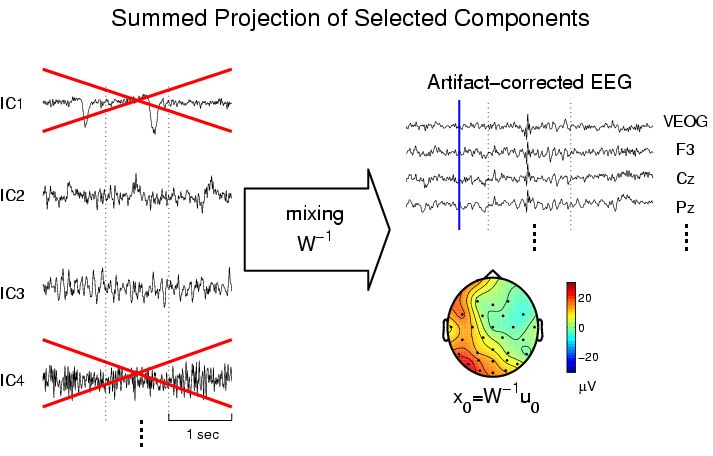 上面的假设2和3对于EEG(或MEG)数据是非常合理的。给定足够的输入数据,第一个假设也是合理的。该方法使用由ICA算法得出的空间滤波器,并且不需要每个伪像源提供参考通道。一旦从数据中提取了不同大脑和伪影源的独立时程,就可以通过消除伪影源的贡献来得出伪影校正的EEG信号。