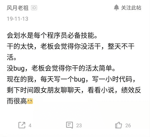就有一位程序员直言会划水是每个程序员的必备技能,现在每天写一个BUG,写一个小时代码,剩下的时间跟女朋友聊天看小说,绩效反而更高了。