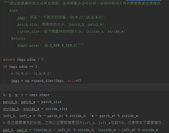 如果切片前做了padding,那么重构后的图像尺寸对应的是padding后的尺寸,因此我们还要裁出原图。我们在padding的时候,原图是放中间的,那么记下之前padding的长度就很容易计算出原图位置了。