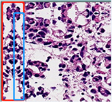 对原图进行镜像填充,能够使模型对边界区域进行预测时获得上下文信息。下图蓝框部分是原图的左上角部分,镜像填充后,得到红框部分。