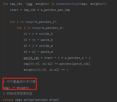 注意,并不是将切片直接放入图像对应位置,而是使用求和(下图中 img +=、weights +=),就是因为切片之间可能存在重叠的部分,我们需要对这些部分求均值。