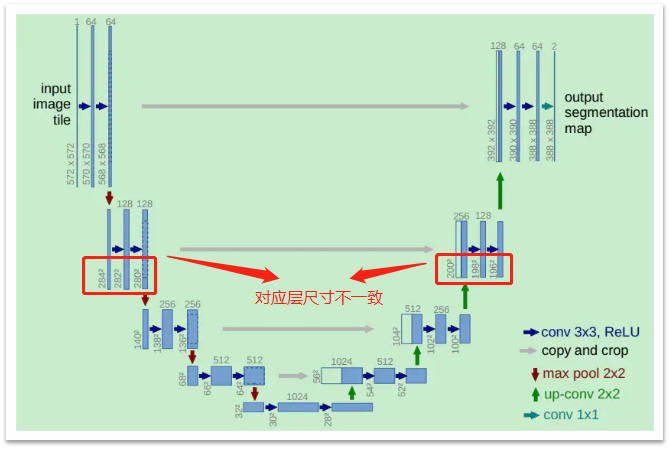 熟悉U-Net结构的炼丹者们肯定清楚,它并不是一个完全对称的结构。也就是说,某一层特征图下采样后再上采样回来到对应层时,其尺寸会发生变化,比原来的小,原因在于U-Net使用的是不带padding的3x3卷积(valid卷积),每次经过这样的一个卷积就会使得特征图尺寸减小2x2。
