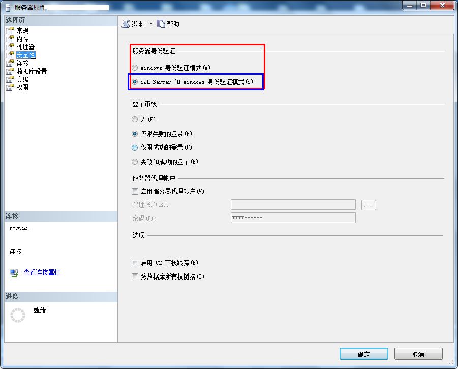 11、切换到“安全性”选项卡,在服务器身份验证中,选中SQL Server和Windows身份验证模式。
