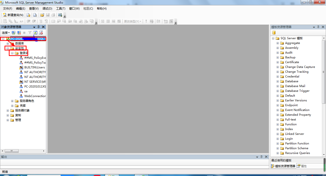 2、定位到[服务器/安全性/登录名],可以选择其中有的登录来登录,也可以自己创建登录名来登录。