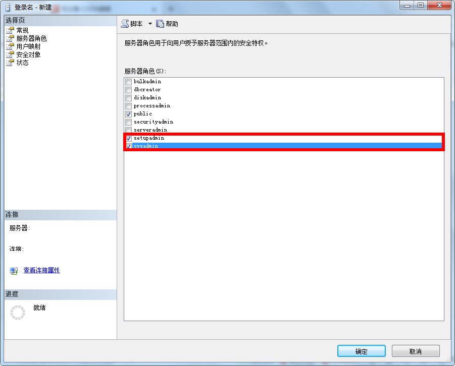5.切换到“服务器角色”选项卡,勾选中setupadmin和sysadmin这两个服务器角色。(文末会附出各服务器角色的权限)