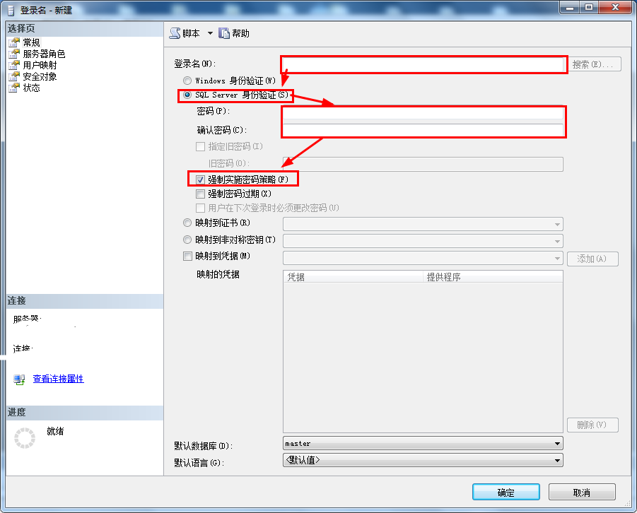 4、先输入你要取得登录名,然后选择SQL Server身份验证,然后输入密码,然后选择强制实施密码策略(这个一定要选,后面那两个可选可不选,看个人需求)