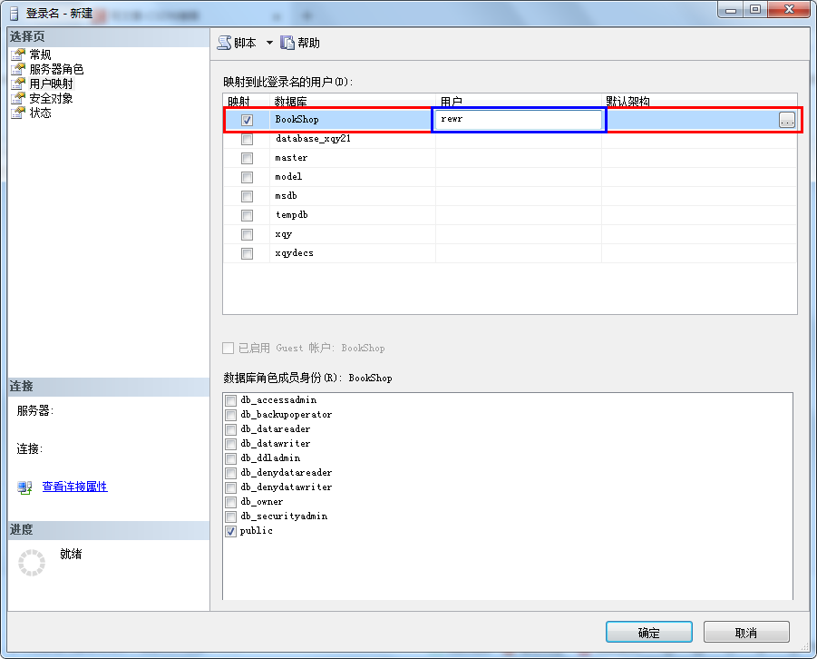 6、切换到“用户映射”选项卡,勾选我们要映射的用户(如果我们要连接数据库的话,勾选要连接的数据库),可以在用户用户一栏中填写你要设置的用户名,如未填写,则与登录名相同。