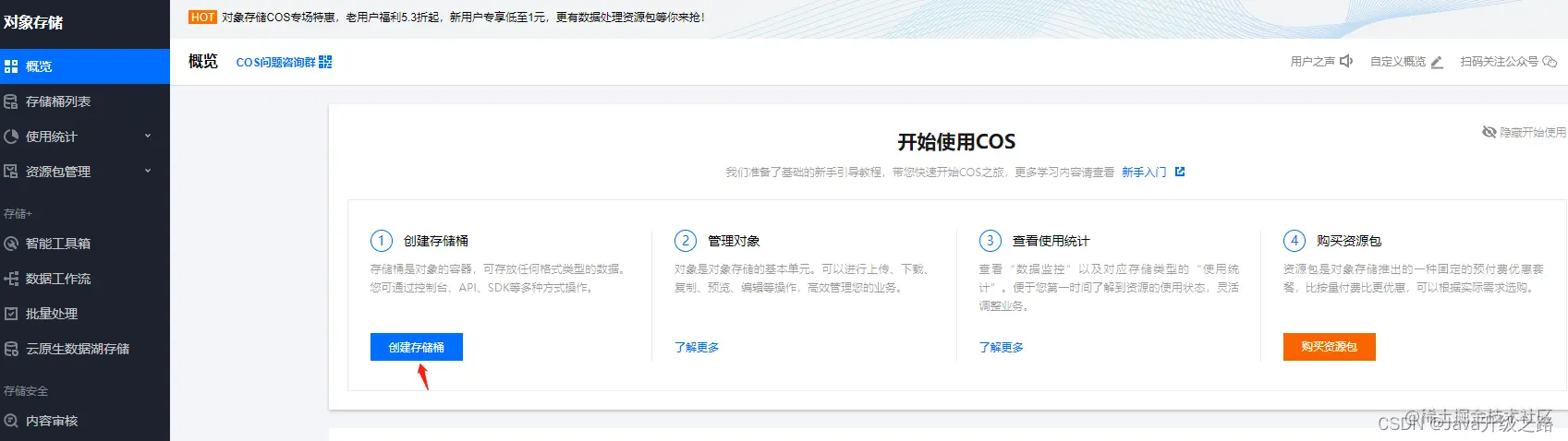 整合前需要做一些准备工作,开通COS对象存储,创建存储通,创建访问密钥。