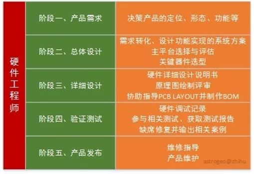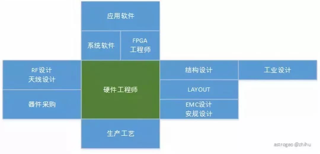 当然上图中所展示的并不完全,比如热设计也是非常重要的一员。但需要说明的是,在整个项目研发团队中,有两个人和所有人打交道,一个就是项目经理,另一个就是硬件工程师。硬件工程师需要和各种研发人员打交道 、协调工作,这也要求硬件工程师具有丰富的知识面和强大的协调能力。