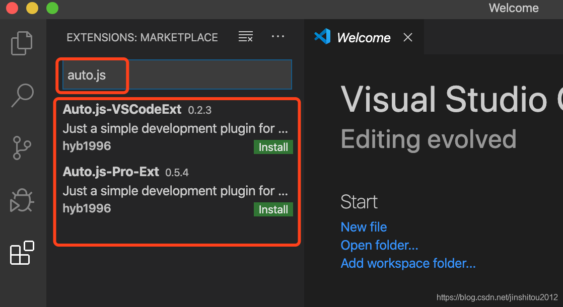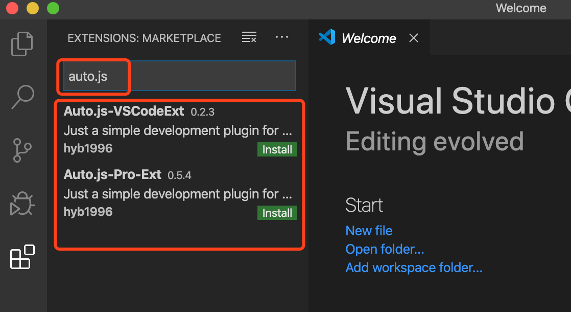 1. PC端打开VS Code 点击EXTENSIONS 搜索Auto.js点击安装