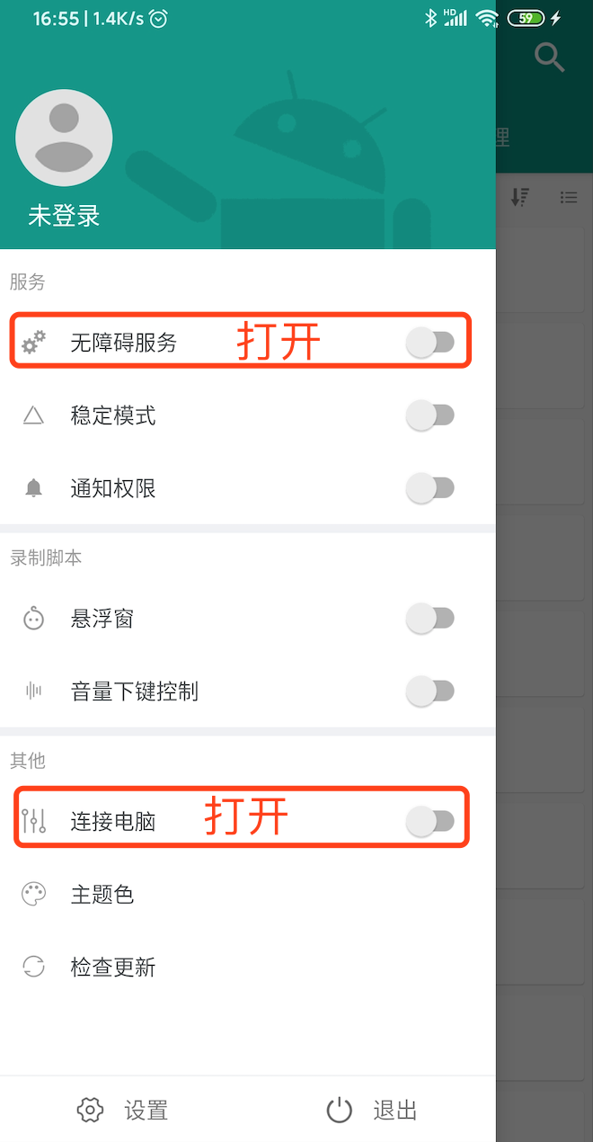 3. 手机端打开Autojs.apk,并且开启无障碍服务,点击连接电脑输入电脑IP进行连接