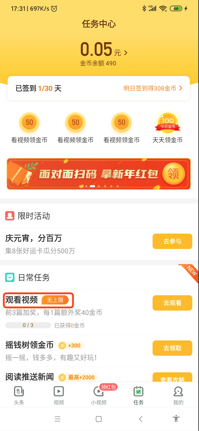 2.找出视频红包对应右上角的 2 ,并点击视频红包进行金币的赚取