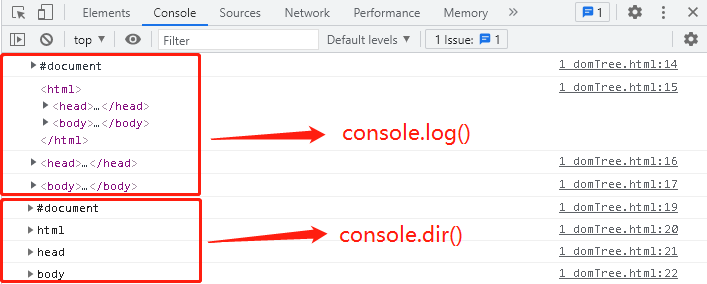 <body><span id="s1">Hello</span><h1>标题一</h1><script>//console.log 输出的不是对象存储结构,而是DOM树结构(节点间关系)console.log(document);console.log(document.documentElement);console.log(document.head);console.log(document.body);//console.dir 输出一个节点对象在内存中的属性结构console.dir(document);console.dir(document.documentElement);console.dir(document.head);console.dir(document.body);</script>