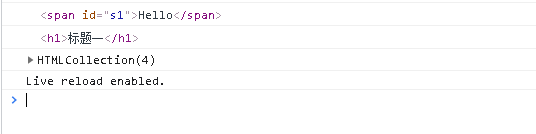 <body><span id="s1">Hello</span><h1>标题一</h1><script>//获得body的第一个直接子元素spanvar span = document.body.firstElementChild;console.log(span);//获得span的下一个兄弟h1var h1 = span.nextElementSibling;console.log(h1);//获得body下所有直接子元素的集合:3个元素var ele = document.body.children;console.log(ele);</script>