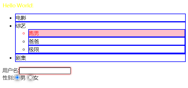 <script>//查找id为nav的一个ul元素var ulNav = document.getElementById("nav");console.log(ulNav);//在id为nav的ul下查找所有livar lis = ulNav.getElementsByTagName("li");console.log(lis);//在id为nav的ul下查找trvar trs = ulNav.getElementsByTagName("tr");console.log(trs);//在body下查找span元素,并将第一个设置为黄色var span = document.body.getElementsByTagName("span")[0];console.log(span);span.style.color = "yellow";//查找id为nav的ul下的所有class为item的元素,并设置边框var items = ulNav.getElementsByClassName("item");// 对查找到的多个元素统一设置时要先遍历for (var item of items) {item.style.border = "2px solid blue";}//查找id为nav的ul下的class为active的一个li,修改其字体颜色为红色,背景色为粉色var li = ulNav.getElementsByClassName("active")[0];li.style.color = "red";li.style.backgroundColor = "pink";//查找name为sex的两个单选框并添加阴影var radios = document.getElementsByName("sex");for (var rad of radios) {rad.style.boxShadow = "0 0 10px black";}//查找一个name为uname的元素,为其添加阴影效果var xm = document.getElementsByName("uname")[0];xm.style.boxShadow = "0 0 5px red";</script>显示结果如下: