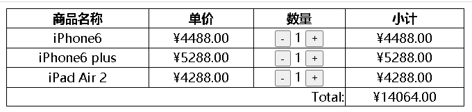 <table id="data"><thead><tr><th>商品名称</th><th>单价</th><th>数量</th><th>小计</th></tr></thead><tbody><tr><td>iPhone6</td><td>¥4488.00</td><td><button>-</button><span>1</span><button>+</button></td><td>¥4488.00</td></tr><tr><td>iPhone6 plus</td><td>¥5288.00</td><td><button>-</button><span>1</span><button>+</button></td><td>¥5288.00</td></tr><tr><td>iPad Air 2</td><td>¥4288.00</td><td><button>-</button><span>1</span><button>+</button></td><td>¥4288.00</td></tr></tbody><tfoot><tr><td colspan="3">Total: </td><td>¥14064.00</td></tr></tfoot></table>