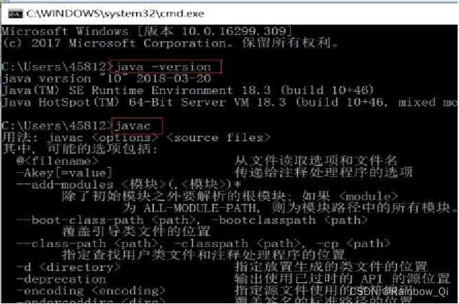 在命令窗口中输入java –version和javac命令,有如下输出提示,则Java 的环境变量配置正确。