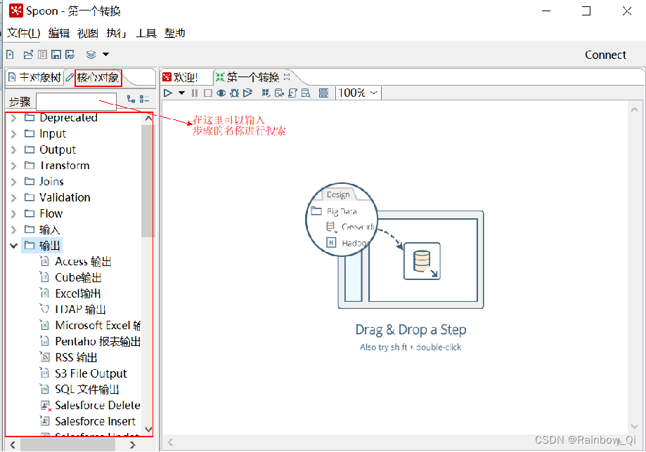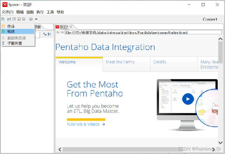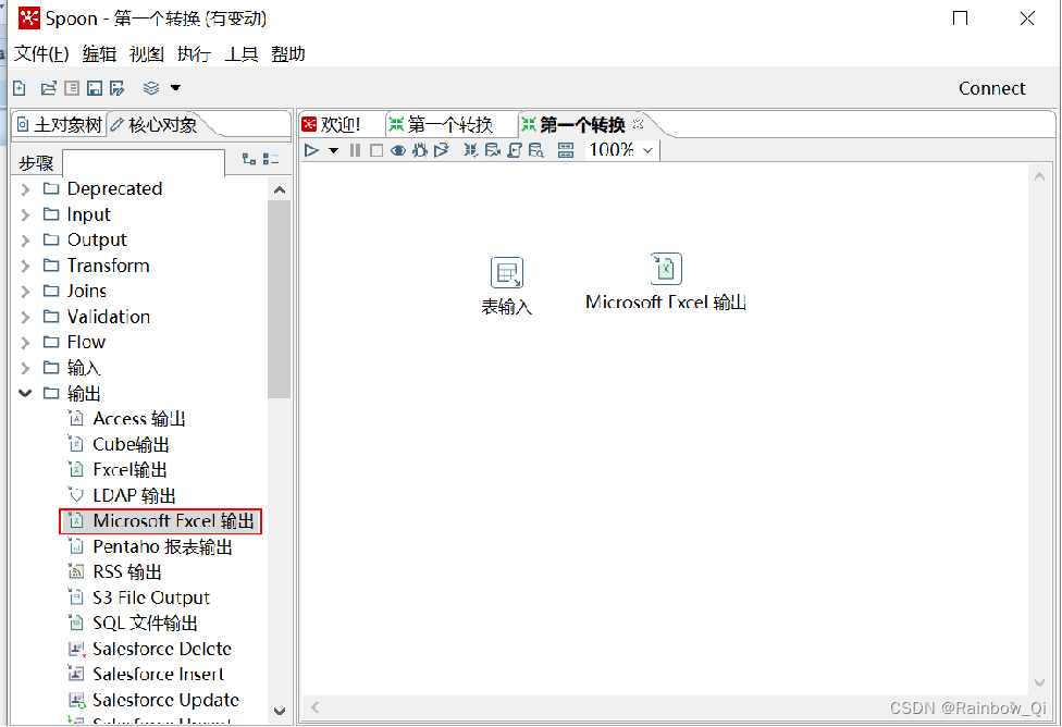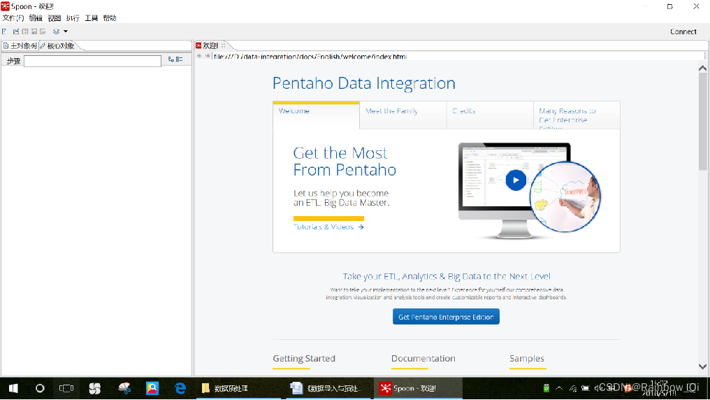 1、运行Spoon.bat后,Kettle将启动Spoon,进入可视化编程界面。