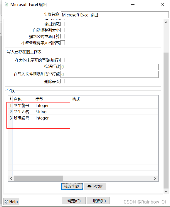 14、在“Microsoft Excel 输出”步骤的配置对话框中,点击选定“内容”进行配置。 点击“获取字段”按钮,获取上个步骤输出的数据字段。 获取后,在“字段”的表格中,显示了已获取的字段。这些字段将在C:\Users\45812\Desktop\etl\ktr\outfile.xlsx文件中输出。