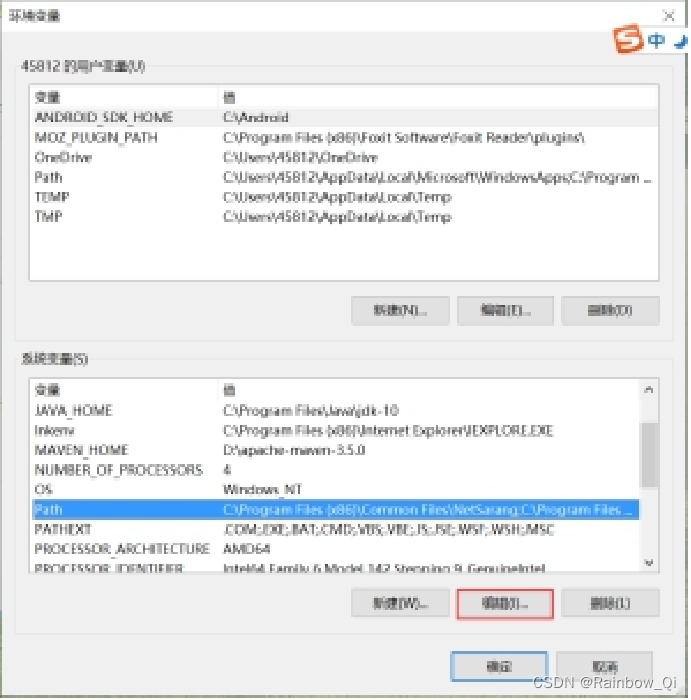 在“系统变量(S)”栏目中,点击Path环境变量,接着点击“编辑(I)…”按钮,以追加的方式开始配置Path环境变量。