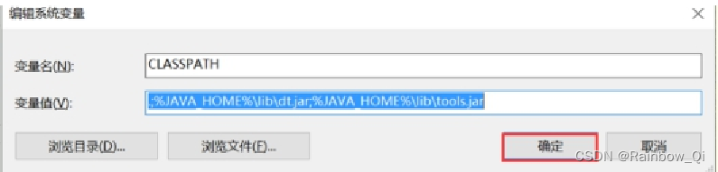 参考JAVA_HOME环境变量的配置操作完成CLASSPATH环境变量的配置。CLASSPATH环境变量的值为 .;%JAVA_HOME%\lib\dt.jar;%JAVA_HOME%\lib\tools.jar,填写完毕后,点击“确定”,完成新建环境变量CLASSPATH的配置。