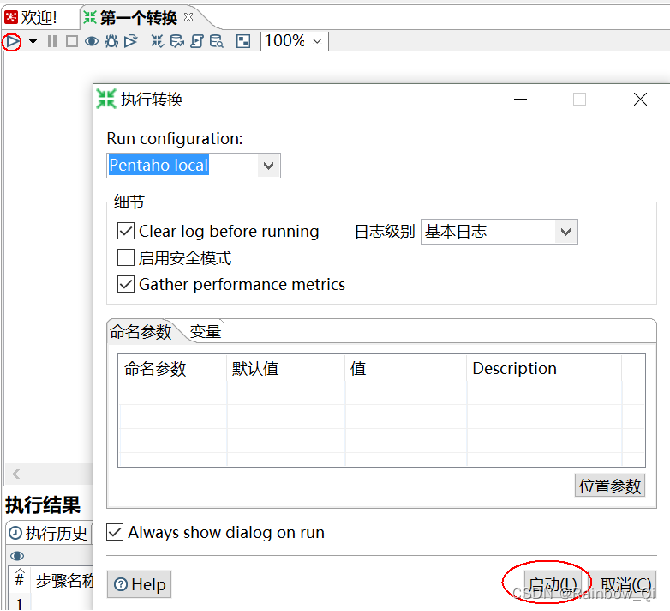 对于Kettle而言,执行的一系列结果在右下方的“执行结果”状态栏中显示。也就是说,“执行结果”状态栏是对转换、作业执行过程的监控。