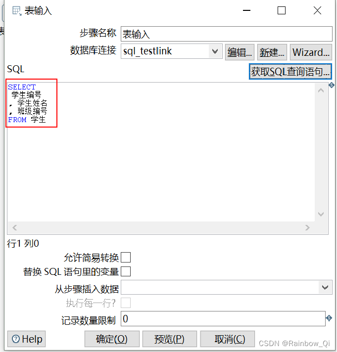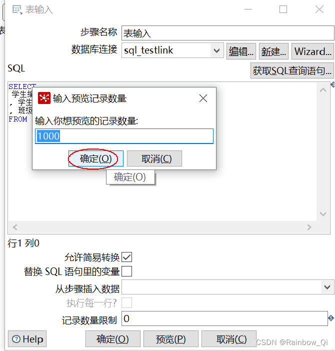 12、选择预览的记录数量,点击“确定”后,将可以查看学生表的数据记录信息。此时,已完成了“表输入”步骤的配置。