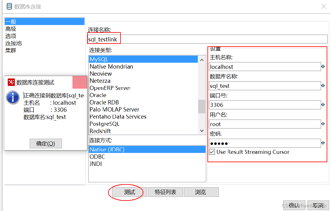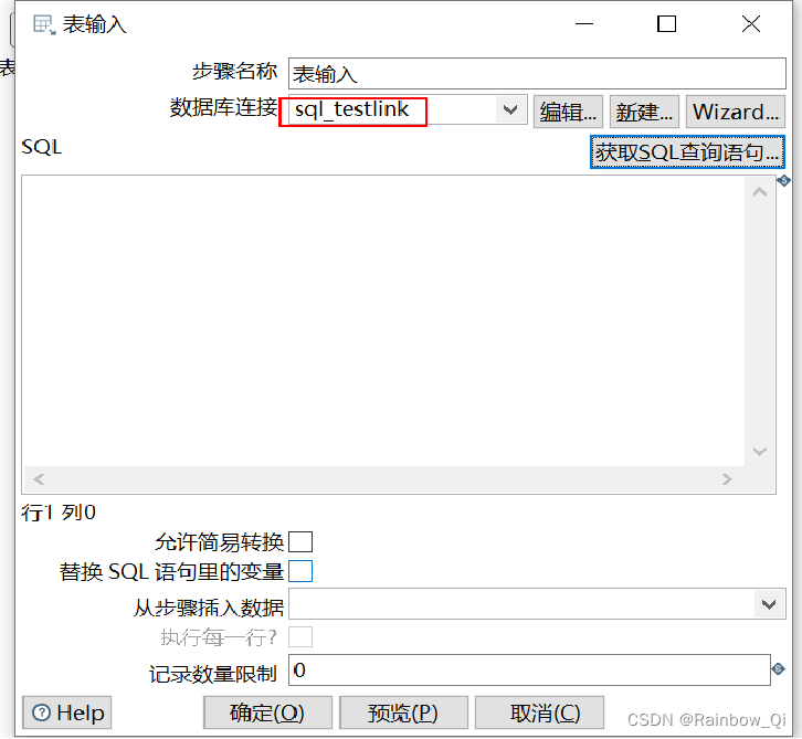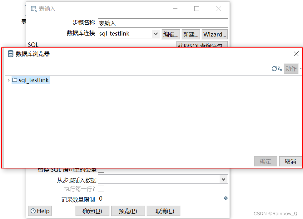 9、配置数据库连接后,“表输入”弹框中会显示新建的数据库连接