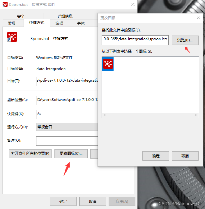 - 为了方便使用,可以为spoon.bat创建一个 Windows桌面快捷方式。创建快捷方式后,右键单击新创建的快捷文件,在弹出菜单中选择属性。打开的属性对话框里显示了快捷方式标签。在这个标签下“更改图标”按钮可以为这个快捷方式选中一个容易识别的图标,一般选择 Kettle目录下的spoon.ico文件。