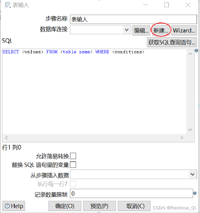 7、双击“表输入”步骤进行配置,在弹出的配置对话框中,点击“新建”按钮配置数据库的连接信息