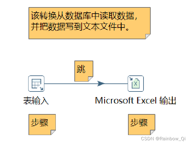 步骤是转换里的基本组成部分。它是一个图形化的组件,可以通过配置步骤的参数,使得它完成相应的功能。例子显示了两个步骤,分别为“表输入”和“Microsoft Excel 输出”。配置“表输入”步骤的参数,可以使得这个步骤从指定的数据库中读取指定关系表的数据;配置“Microsoft Excel 输出” 步骤的参数,可以使得这个步骤向指定的路径创建一个Excel表格,并写入数据。当这两个步骤用跳(箭头连接线)连接起来的时候,“表输入”步骤读取的数据,通过跳,传输给了“Microsoft Excel 输出”步骤。最终,“Microsoft Excel 输出”步骤把“表输入”所读取的数据,写入到Excel表格中。这个跳,对“表输入”而言,是个输出跳;对“Microsoft Excel 输出”而言,是个输入跳。