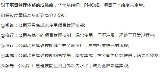 华为首先在营销和研发等体系引入项目管理,并经过多年实践推广至目前的变革、基建等领域。截至2018年,华为已拥有各类认证的各级别专职项目经理近5000人。