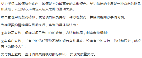 华为项目管理文化与华为企业文化一脉相承,是华为核心价值观的内涵在项目管理活动中的延伸和丰富,华为项目管理文化的精髓包括如下几方面: