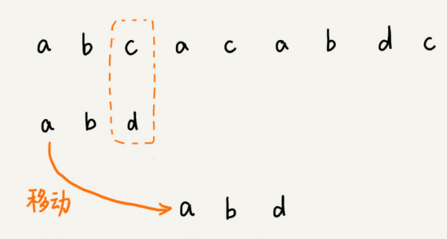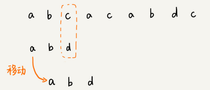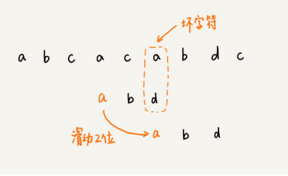 我们将模式串滑动到c之后,就会发现,模式串中的最后一个字符d,还是无法与主串中的字符a相互匹配。此时,我们是否能将模式串滑动到主串中坏字符a(主串中第三个a)的后面?