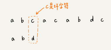 我们用坏字符c在模式串中查找,发现模式串中并不存在这个字符,也就是说,字符c与模式串中的任何字符都不可能匹配。这个时候,我们就可以将模式串直接滑动到字符c的后面,再重新从模式串的末尾字符开始比较。