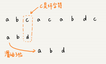 主串中的字符c在模式串中没有对应的字符,就肯定无法匹配。因此,我们可以一次性把模式串往后多滑动几位,把模式串移动到字符c的后面,如下图。