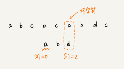当模式串与主串不匹配时,我们把坏字符对应的模式串中的字符在模式串中的下标记作为si。如果坏字符在模式串中存在,那么我们把坏字符在模式串中的下标记作xi,如果坏字符在模式串中不存在,那么我们把xi记作-1。那么,模式串往后滑动的位数就等于si-xi。