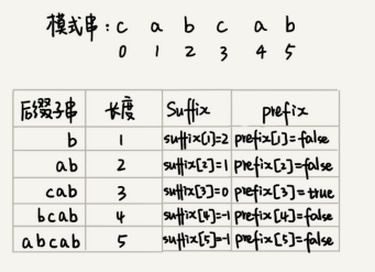 如果我们只记录刚刚定义的 suffix,实际上,只能处理规则的前半部分,也就是,在模式串 中,查找跟好后缀匹配的另一个子串。所以,除了 suffix 数组之外,我们还需要另外一个 boolean 类型的 prefix 数组,来记录模式串的后缀子串是否能匹配模式串的前缀子串。