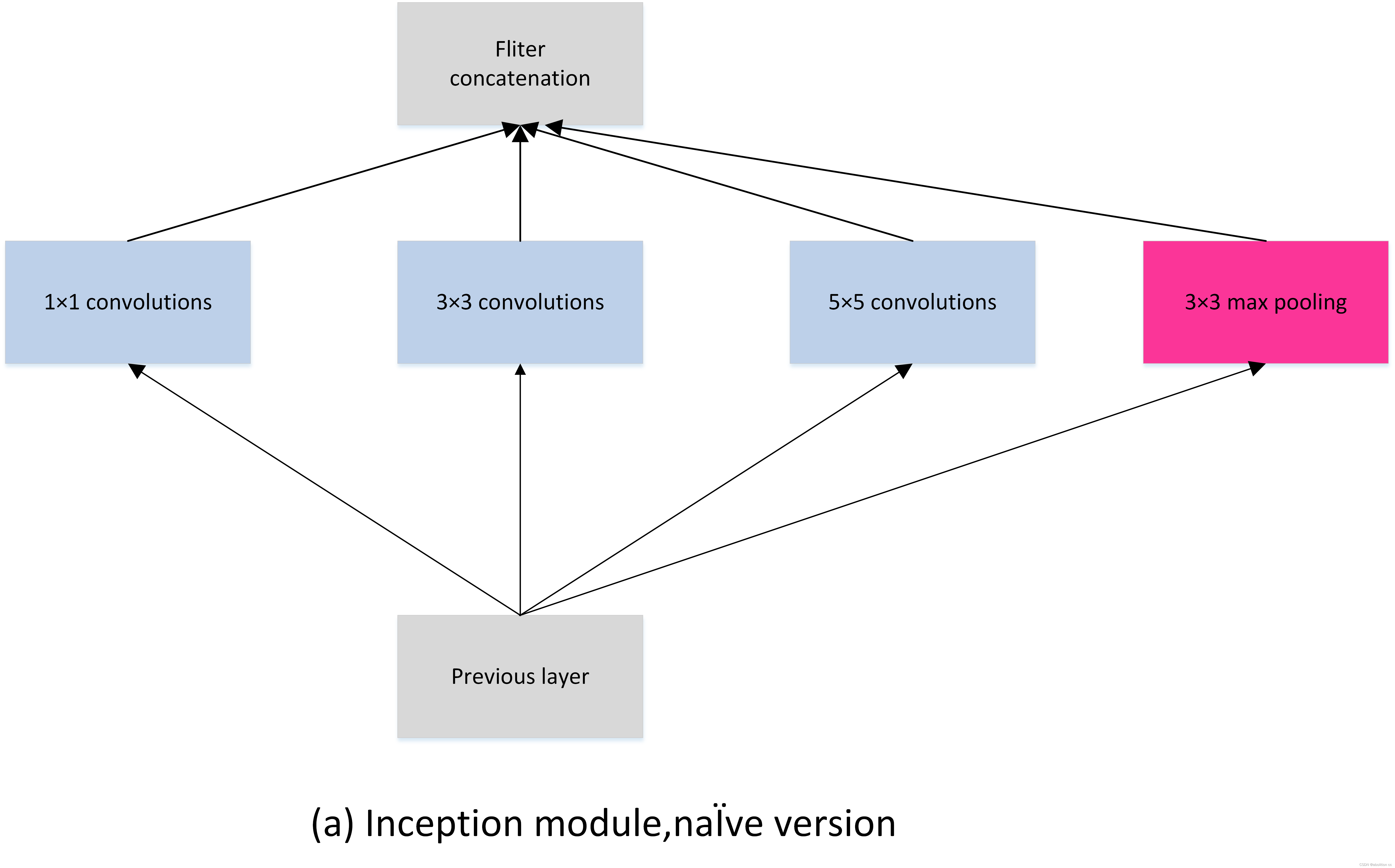 之所以卷积核大小采用1、3和5,主要是为了方便对齐。设定卷积步长stride=1之后,只要分别设定pad=0、1、2,那么卷积之后便可以得到相同维度的特征,然后这些特征就可以直接拼接在一起了;