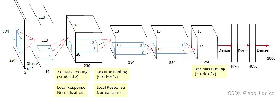 卷积层 C 1 C_1 C1输入为 224 × 224 × 3 224\times224\times3 224×224×3的图片数据,分别在两个GPU中经过核为 11 × 11 × 3 11\times11\times3 11×11×3、步长(stride)为4的卷积卷积后,分别得到两条独立的 55 × 55 × 48 55\times55\times48 55×55×48的输出数据。