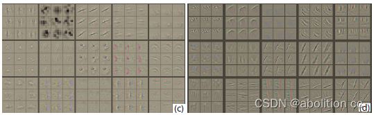 (c)AlexNet第二层输出的特征图(d)ZFNet第二层输出的特征图