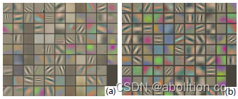 图4.5 (a)ZFNet第一层输出的特征图(b)AlexNet第一层输出的特征图