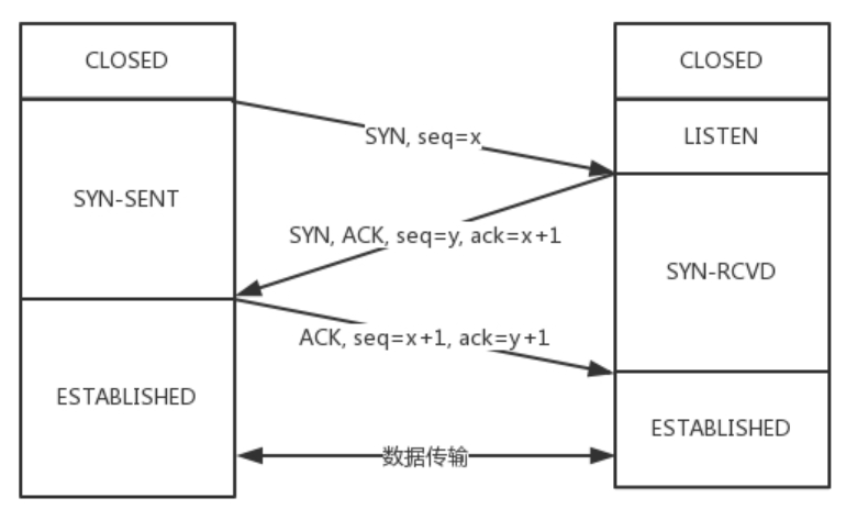 一开始,客户端和服务端都处于 CLOSED 状态。先是服务端主动监听某个端口,处于 LISTEN 状态。然后客户端主动发起连接 SYN,之后处于 SYN-SENT 状态。服务端收到发起的连接,返回 SYN,并且 ACK 客户端的 SYN,之后处于 SYN-RCVD 状态。客户端收到服务端发送的 SYN 和 ACK 之后,发送 ACK 的 ACK,之后处于 ESTABLISHED 状态,因为它一发一收成功了。服务端收到 ACK 的 ACK 之后,处于 ESTABLISHED 状态,因为它也一发一收了。