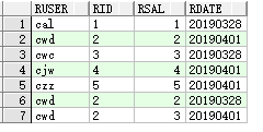 RUSER(用户名) RID(用户编号) RSAL(用户消费) RDATE(日期)