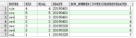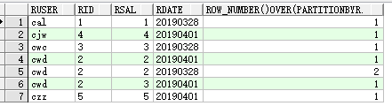 select r.*,row_number() over(partition by r.ruser, r.rid, r.rsal order by rdate desc) rn