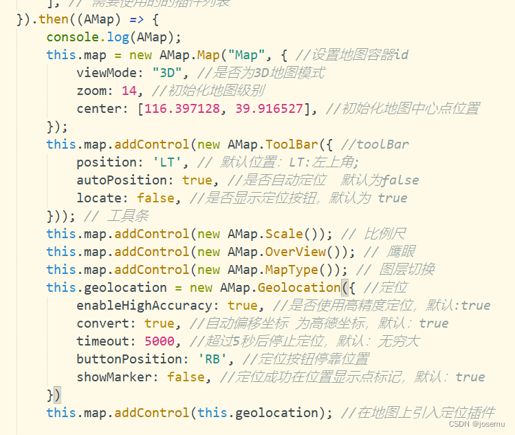 this.geolocation = new AMap.Geolocation({ //定位enableHighAccuracy: true, //是否使用高精度定位,默认:trueconvert: true, //自动偏移坐标 为高德坐标,默认:truetimeout: 5000, //超过5秒后停止定位,默认:无穷大buttonPosition: 'RB', //定位按钮停靠位置showMarker: false, //定位成功在位置显示点标记,默认:true