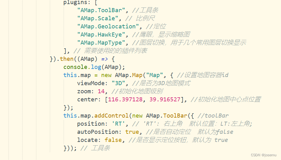 plugins: ["AMap.ToolBar", //工具条"AMap.Scale", // 比例尺"AMap.Geolocation", //定位"AMap.HawkEye", //鹰眼,显示缩略图"AMap.MapType", //图层切换,用于几个常用图层切换显示