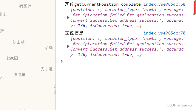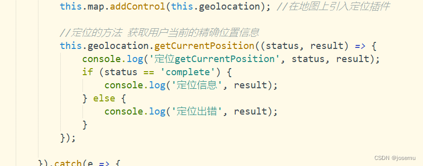 this.geolocation.getCurrentPosition((status, result) => {console.log('定位getCurrentPosition', status, result);if (status == 'complete') {console.log('定位信息', result);} else {console.log('定位出错', result);}