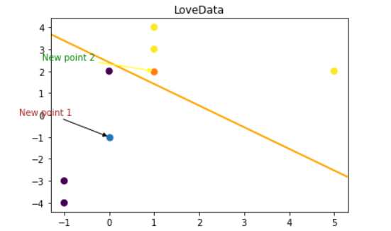 可以发现训练好的回归模型将X_new1预测为了类别0(判别面左下侧),X_new2预测为了类别1(判别面右上侧)。其训练得到的逻辑回归模型的概率为0.5的判别面为上图中橙色的线