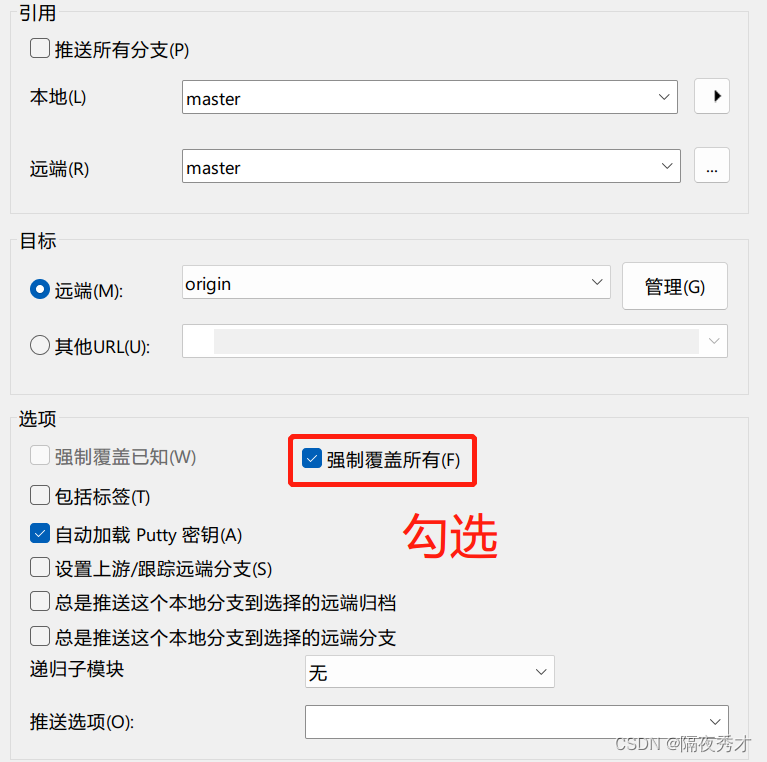 如果是用tortoisegit的就是在推送的时候勾选强制覆盖所有,作用就是跟上面命令行加后缀差不多,无视无关历史进行合并